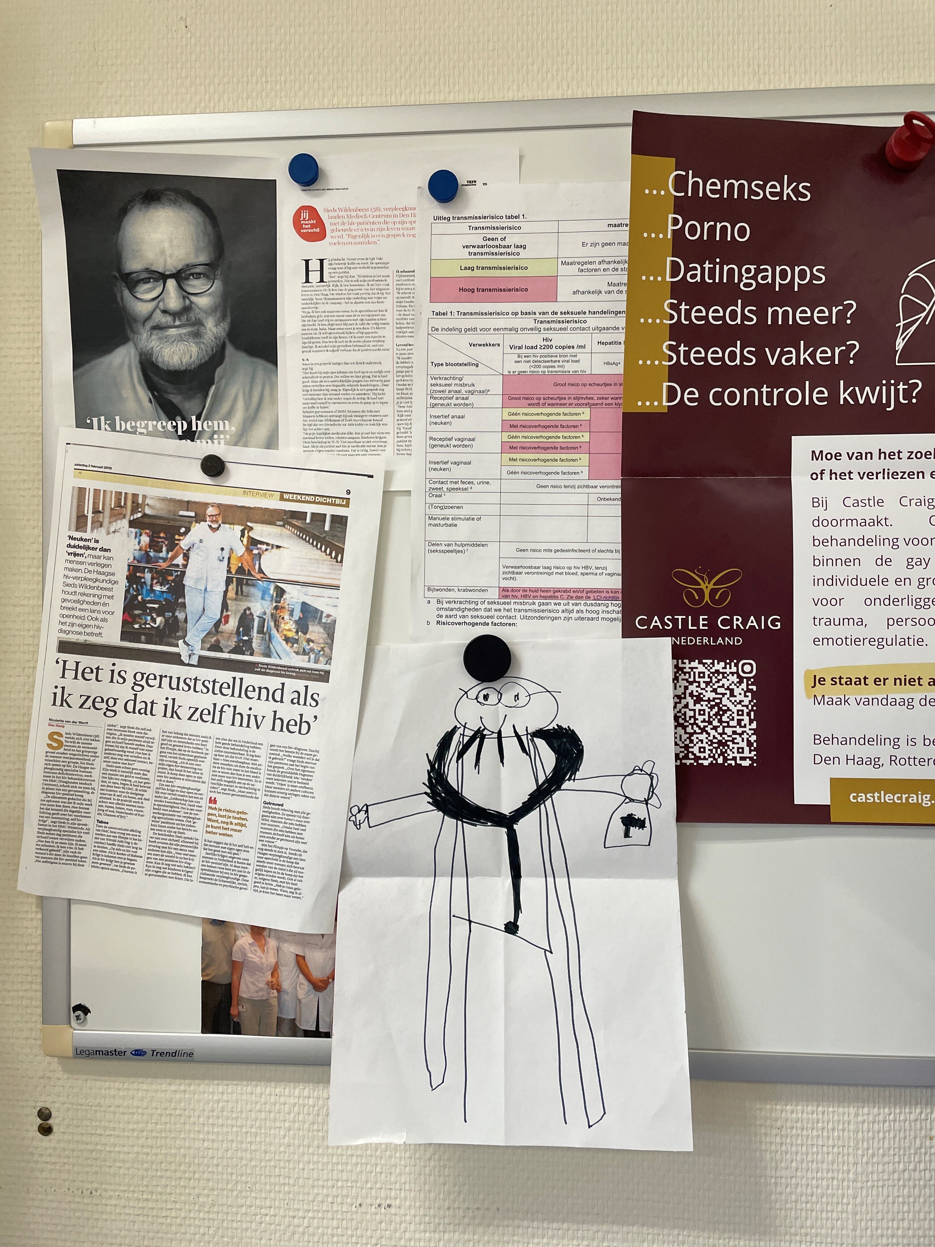 Die vraag kende Sieds ook zelf. In zijn spreekkamer hangt een interview uit de krant. De kop zegt het al: “Het is geruststellend als ik zeg dat ik zelf hiv heb.” Ja, ook Sieds leeft met hiv. “Als ik niet open ben, hoe kan ik dat dan verwachten van mijn patiënten?” Maar open zijn naar de wereld is niet altijd zo simpel.” Hij pauzeert even. “Dus ik zeg liever: wees open naar jezelf. Accepteer dat je dit hebt. En voel je niet schuldig.”