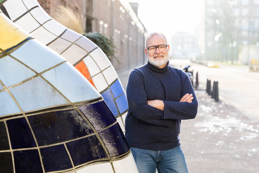 Sieds Wildenbeest bij de ‘wachtende figuren’ van Jan Snoeck voor HMC Westeinde, waar hij 30 jaar hiv-zorg gaf.